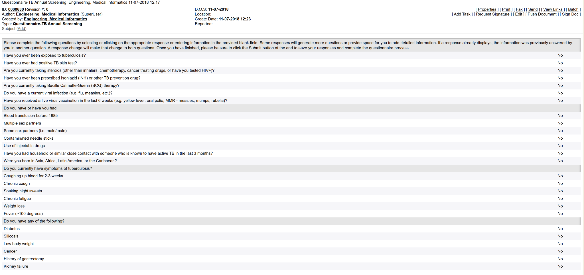 Questionnaire data is grouped together by date of service in a document. The document type name is stored as a questionnaire so it will display within the appropriate chart tab in a chart. In addition, questionnaire data may be linked to the encounter for that date of service.