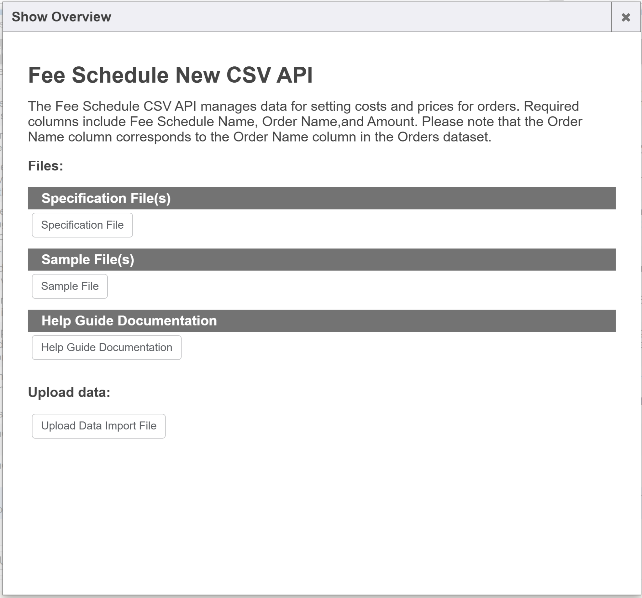 The Fee Schedule CSV API manages data for setting costs and prices for orders. Required columns include Fee Schedule Name, Order Name, and Amount. Please note the the Order Name column corresponds to the Order Name column in the Orders dataset. The difference between the two Fee Schedule Imports is that Billing Code is not a required field in this import.
