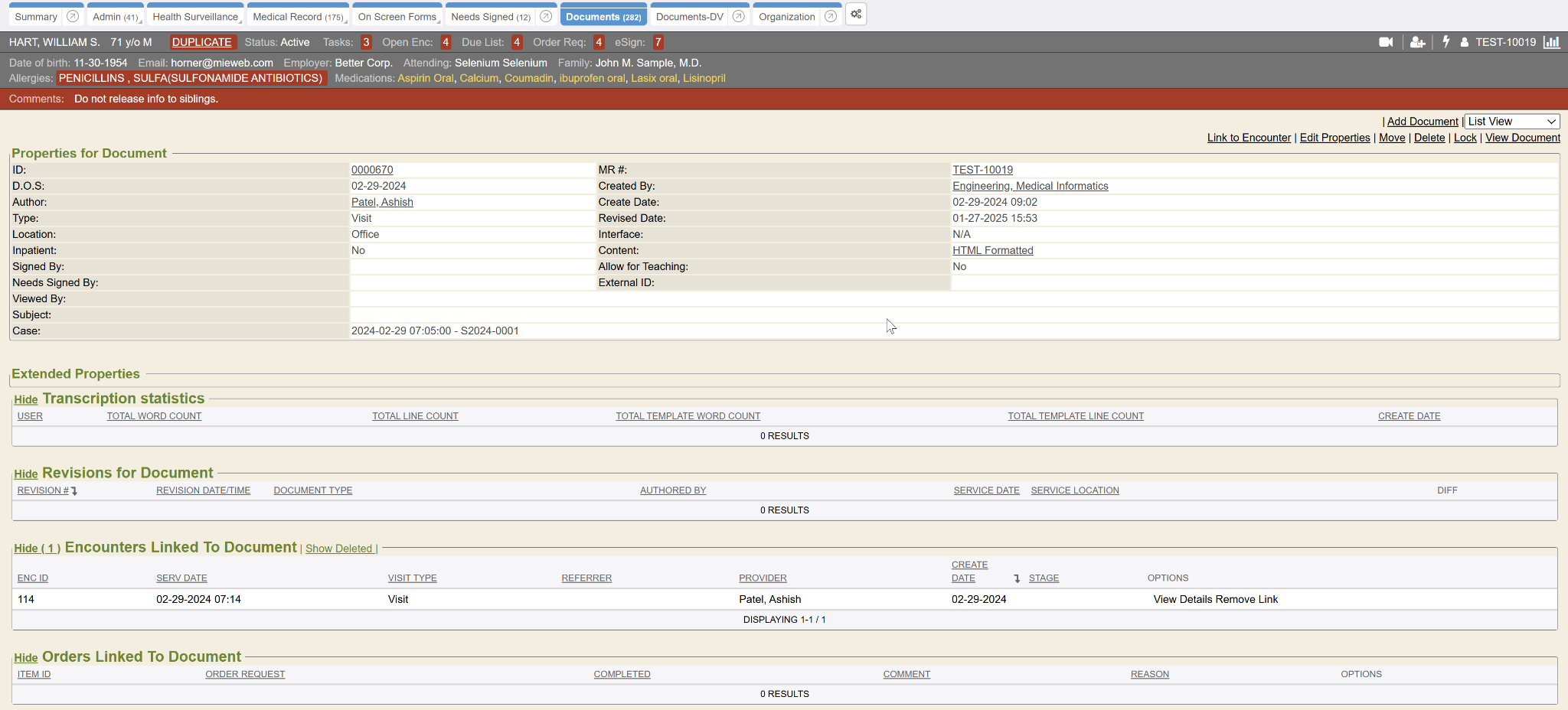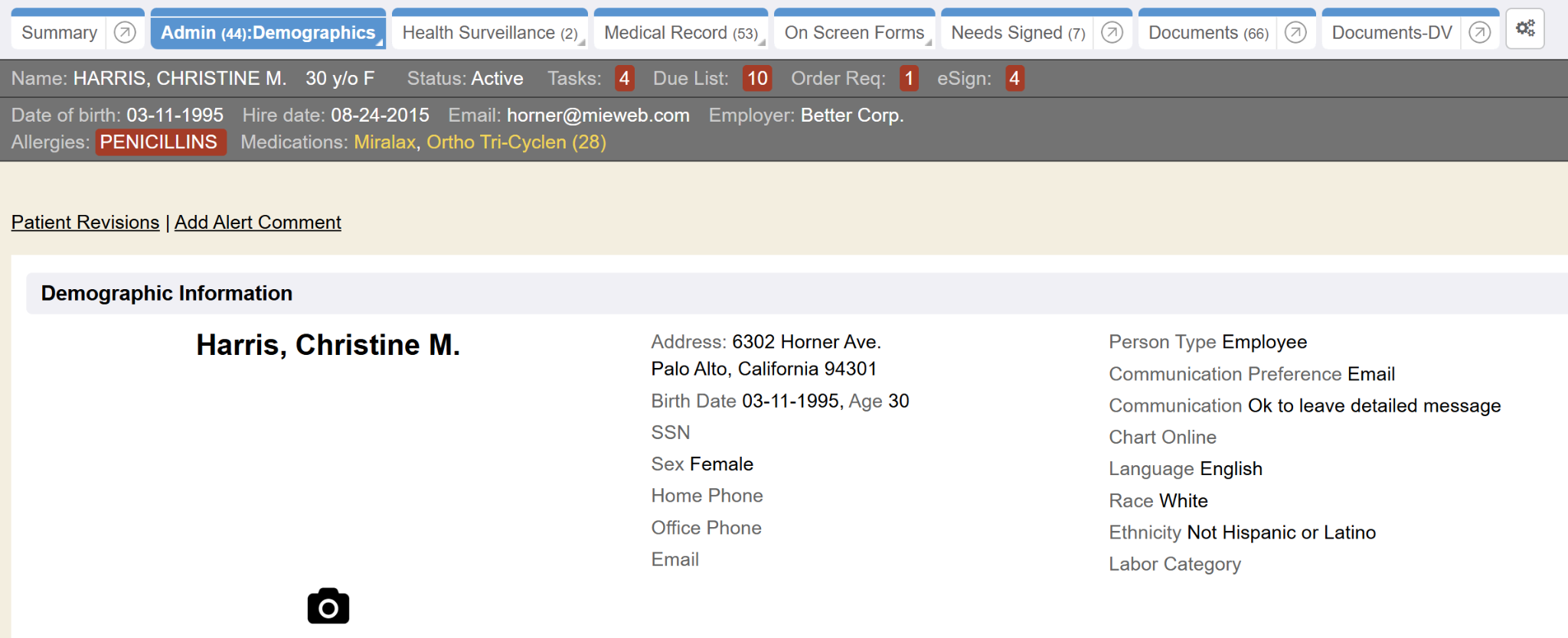Administrative demographic fields are in a separate table and store specific employment information such as supervisor information, cost center, job description, and work schedule. A history of revisions is stored indicating the date/time of the change. This is available from the Patient Revisions hyperlink.
