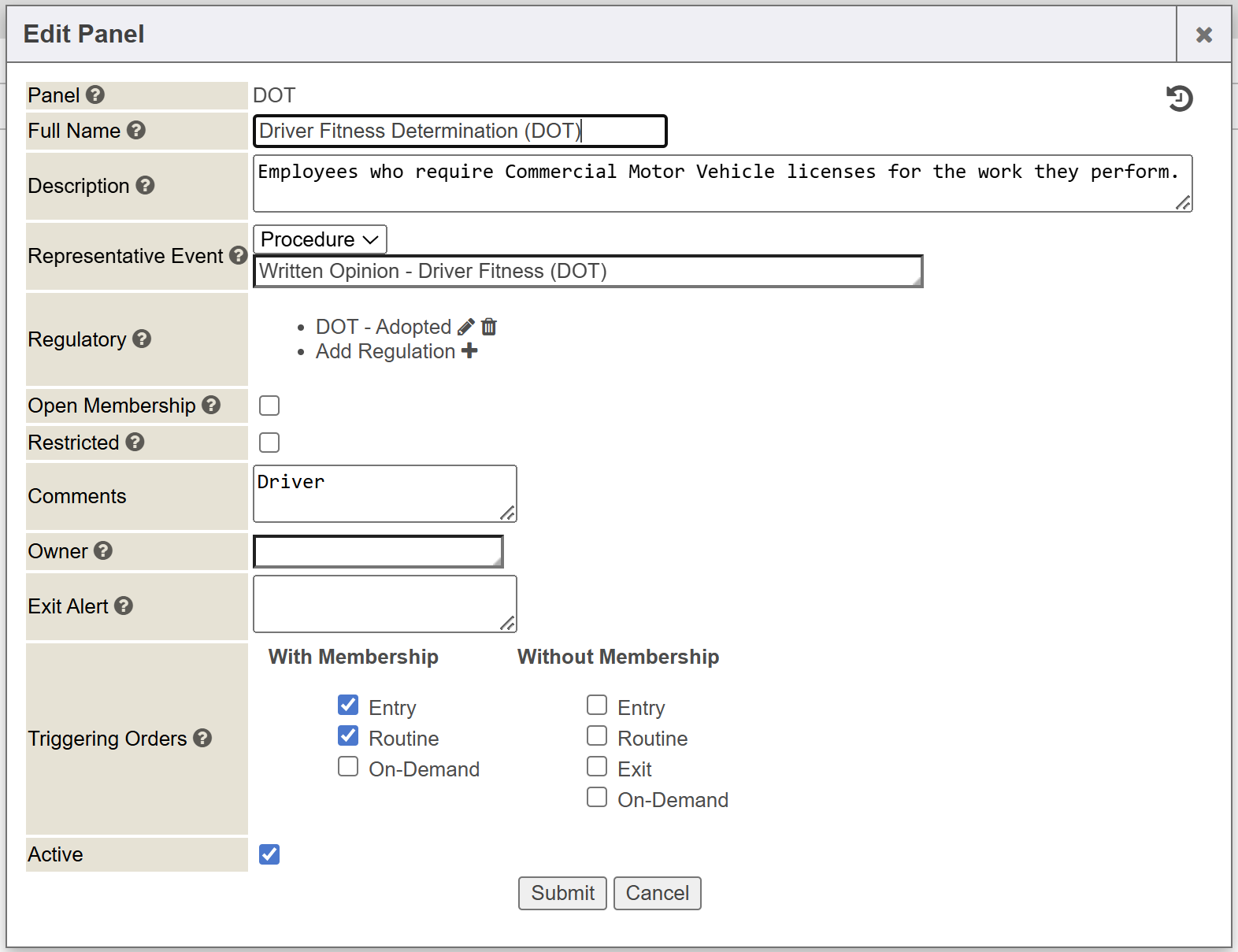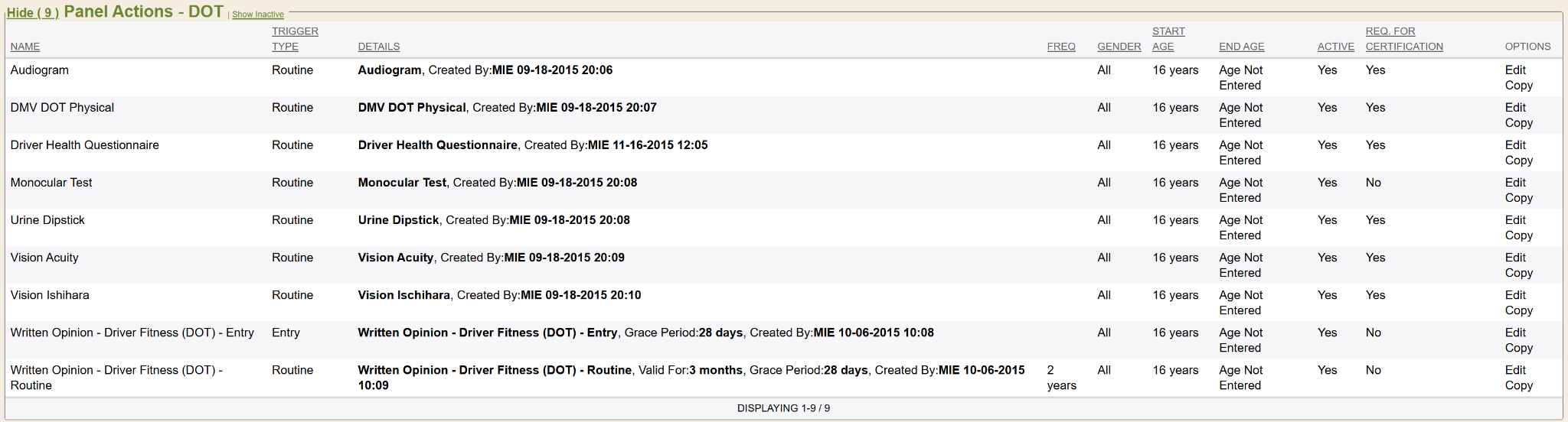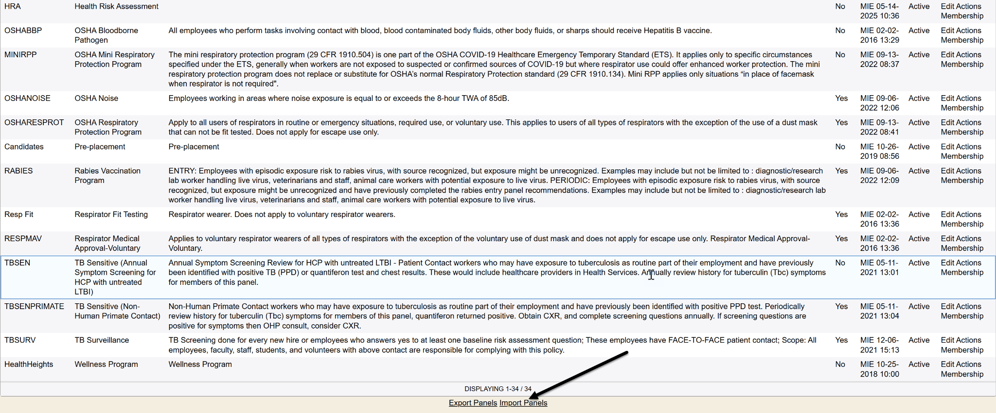 A panel defines a group of events or actions that will take place on certain profiles of people on a regular schedule in the Health Surveillance module of the MIE system. Panels are sometimes referred to as exposure groups, as panels are used for groups exposed to certain hazards due to their job roles. The panels table is also used to document regularly scheduled voluntary health screenings or checkups. A panel action refers to a procedure that is completed for an employee as part of a panel.