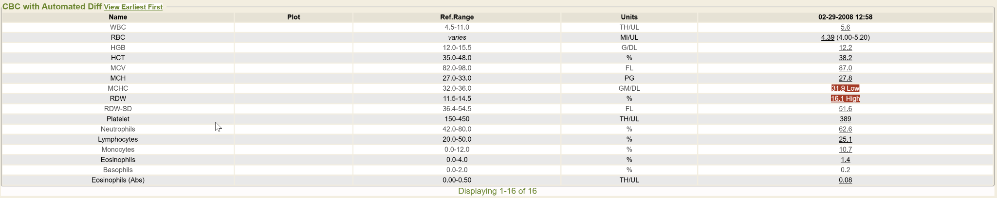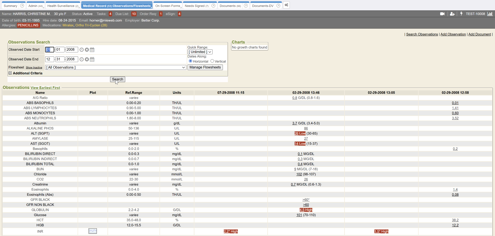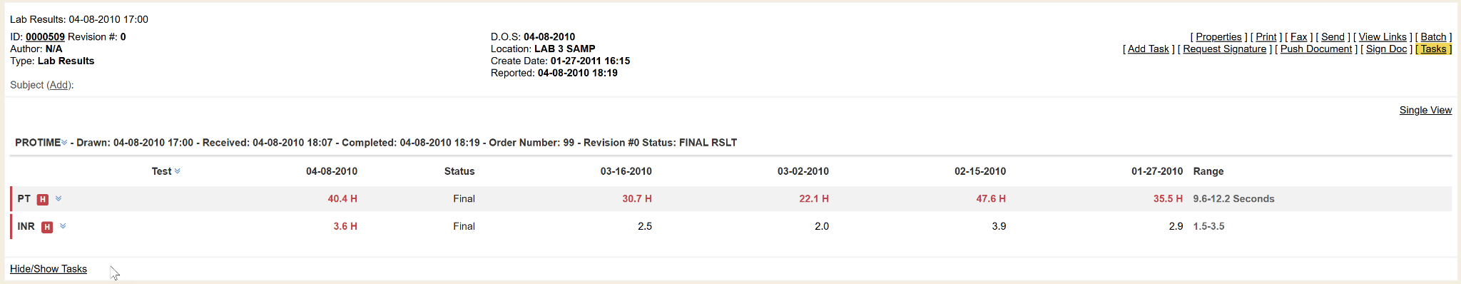 Lab results are stored in a chart as a document; a document may contain multiple lab results. HL7 messages send all of the information used to create a lab document. The common order segment (ORC) message with visit information (DOS) creates the document in the MIE system’s database. The observation request (OBR) message includes the order number and panel or test name to create the lab request. The observation segment (OBX) transmits the observed date, results, units, and range to create the observation. Revisions are stored as well as the date/time the results were received. All lab results are stored both as discrete date (for trending and flowsheet purposes) and as a document. Abnormal results are highlighted in red.