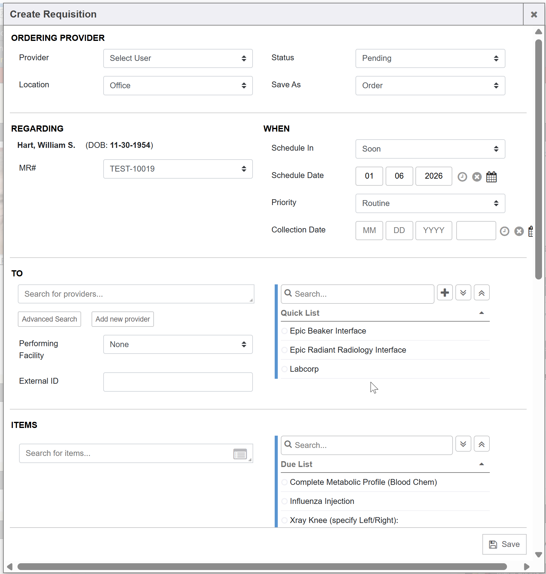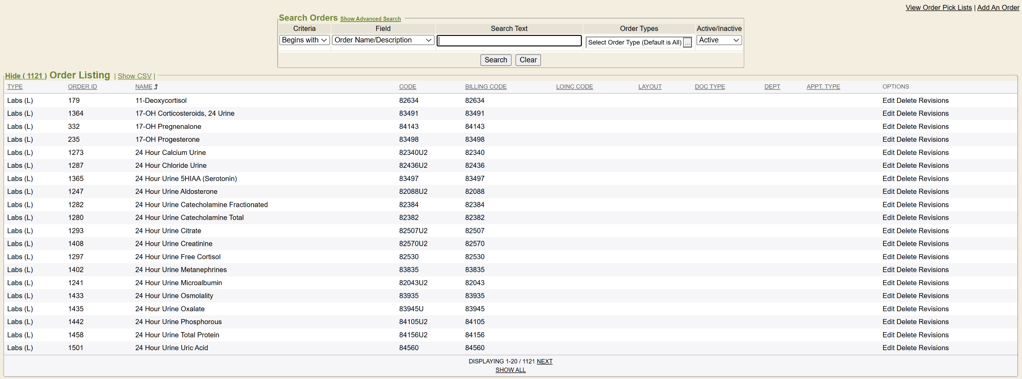 A standard orders compendium is included in the initial installation, however there is an editor for a system administrator to manually add/remove/edit orders and order pick lists within the MIE system. In addition, all orders for lab facilities can store the order code, Billing code, and LOINC code.