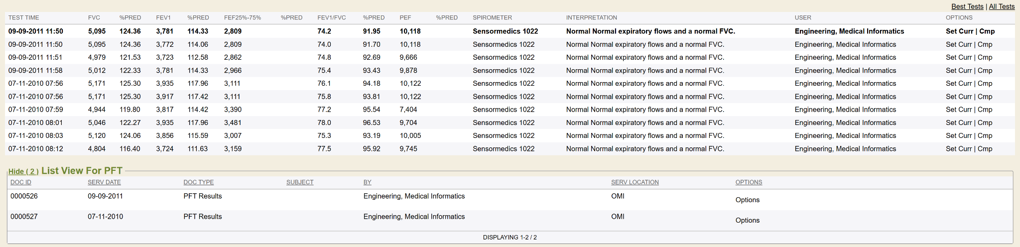 Spirometry, or pulmonary function tests (PFT), are stored for individual employees. Additional information on the employee’s height and weight is recorded to compare to predicted results. The comparison tool displays PFT information in a flowsheet format. The PFT Data CSV API imports data related to spirometry.