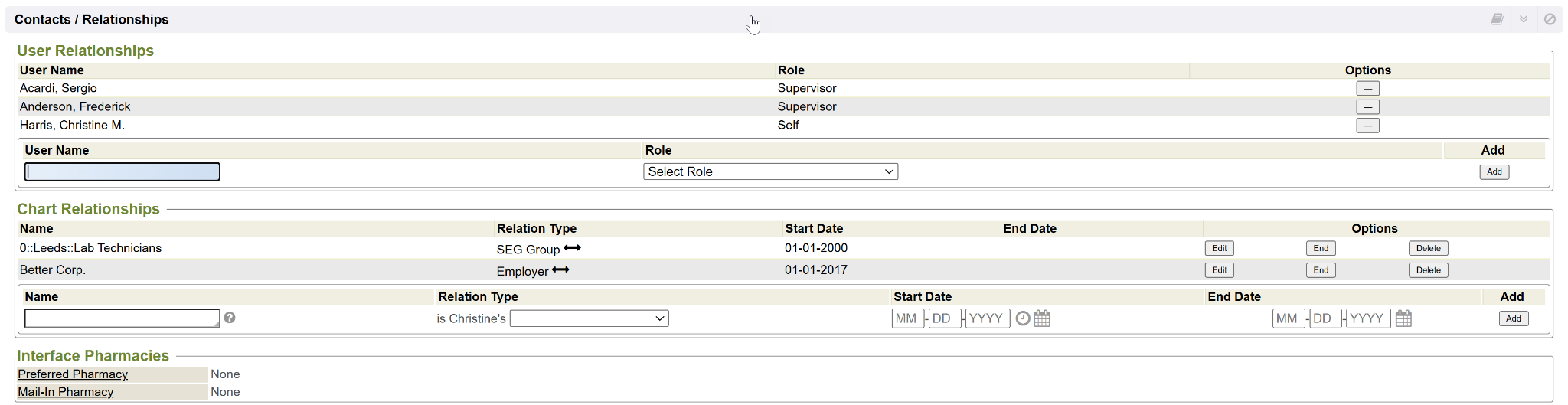 A chart can represent a person, organization, or other entity. Chart-to-chart relationships are used by the Enterprise Health systems to connect a patient (employee) to another patient, employee group (patient population), or non-employees. The relationship link works with security restrictions to determine who has access to view information on specific charts. Relationships display in the demographics chart tab.