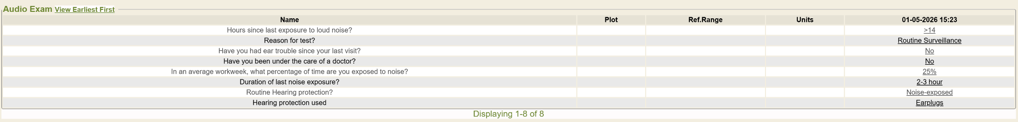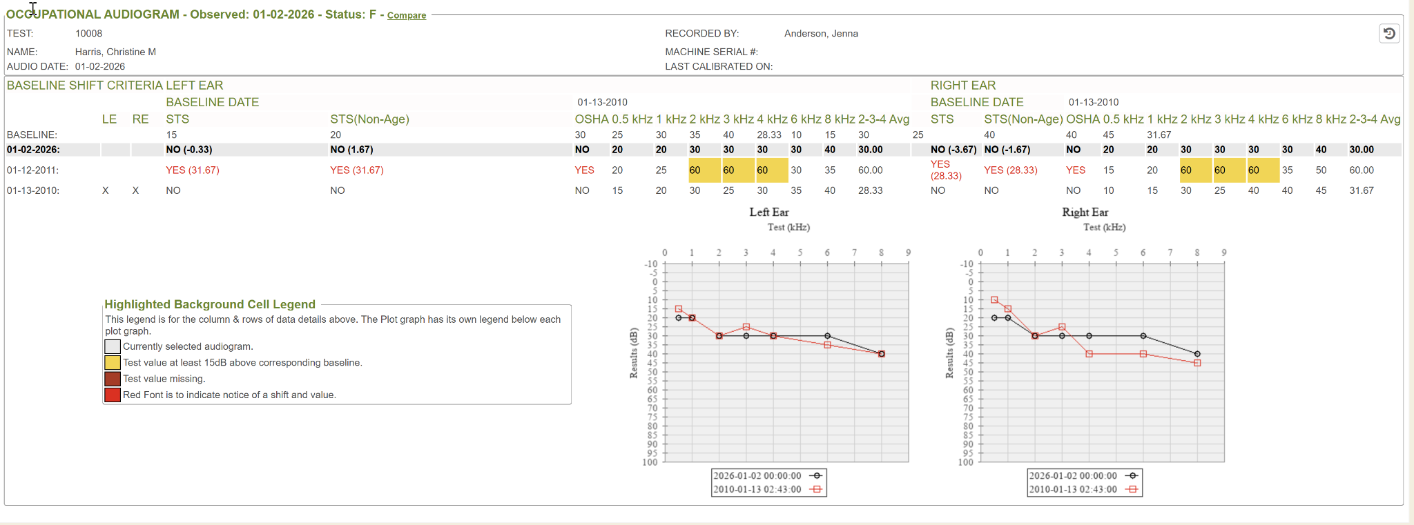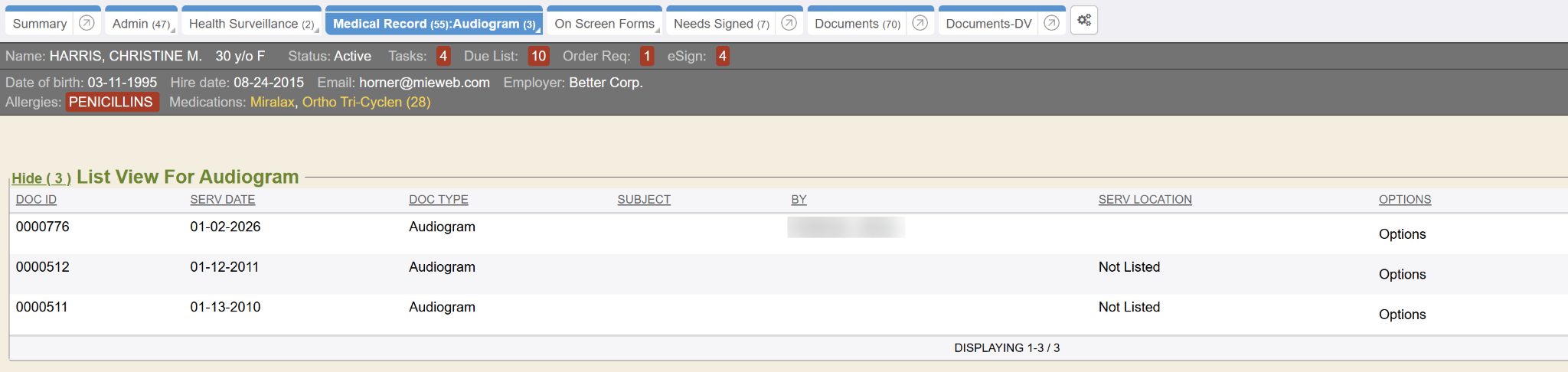 MIE systems store discrete data for occupational audiogram tests. Audio tests are linked to a chart through a document. Audiogram data contains a number of specific tests and baselines aggregated into a single document. Previous audiogram data can be aggregated to display graphically in a document.