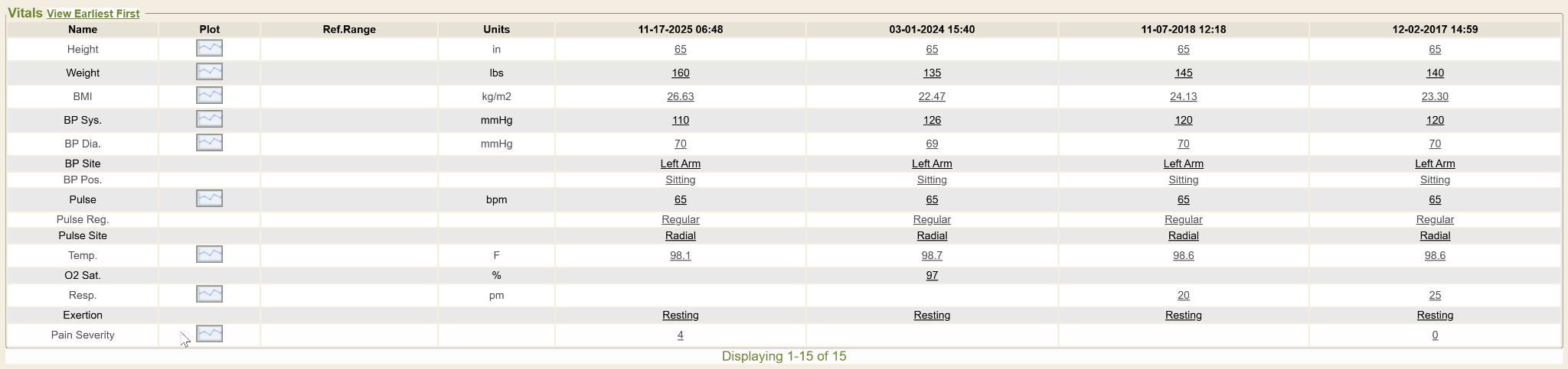 The vitals flowsheet displays in the Vitals chart tab and within the visit encounter.