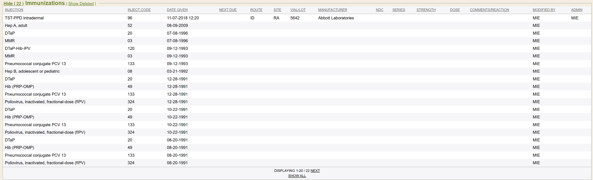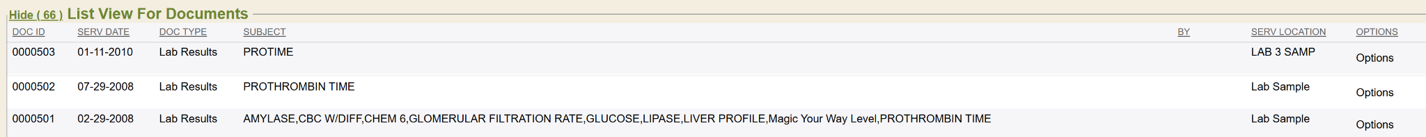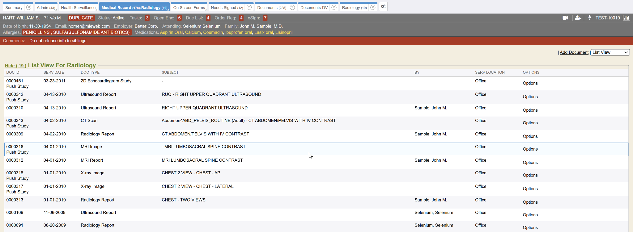 Historical x-ray reports are imported as a document. Specific discrete data fields may also be viewed in a flowsheet format. In addition, the MIE system has the ability to store digital radiology (DICOM) images.
