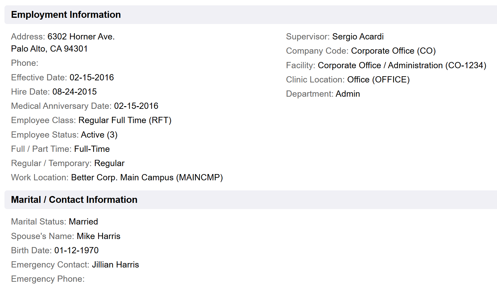 Standard demographics display employee information such as name, DOB, gender, address, phone number, email address and employer information. Information in the HR import file is mapped to the appropriate demographic field. A history of revisions is stored indicating the date/time of the change.
