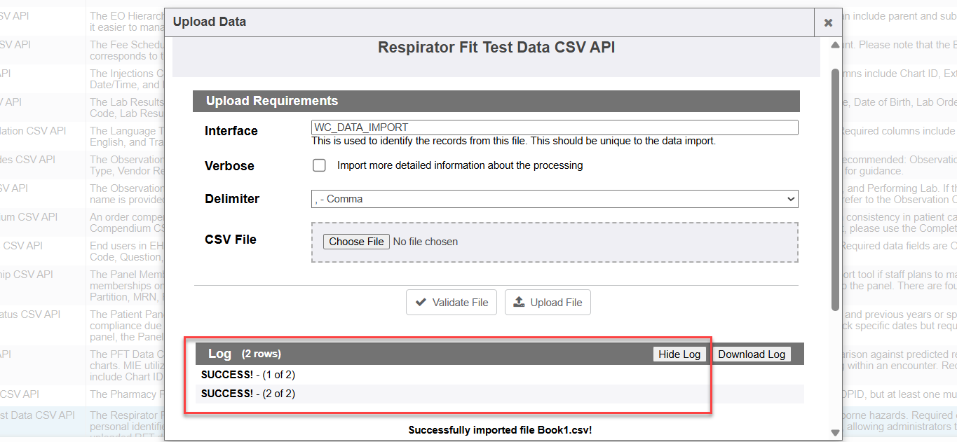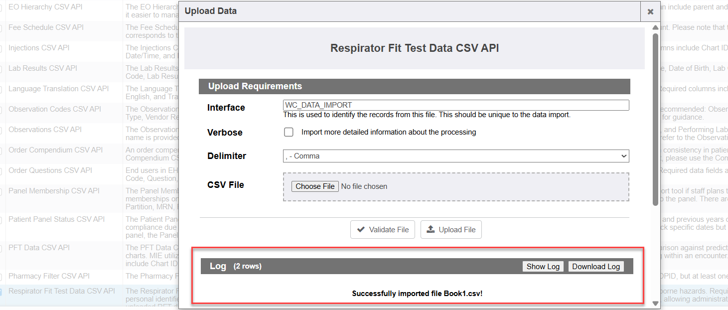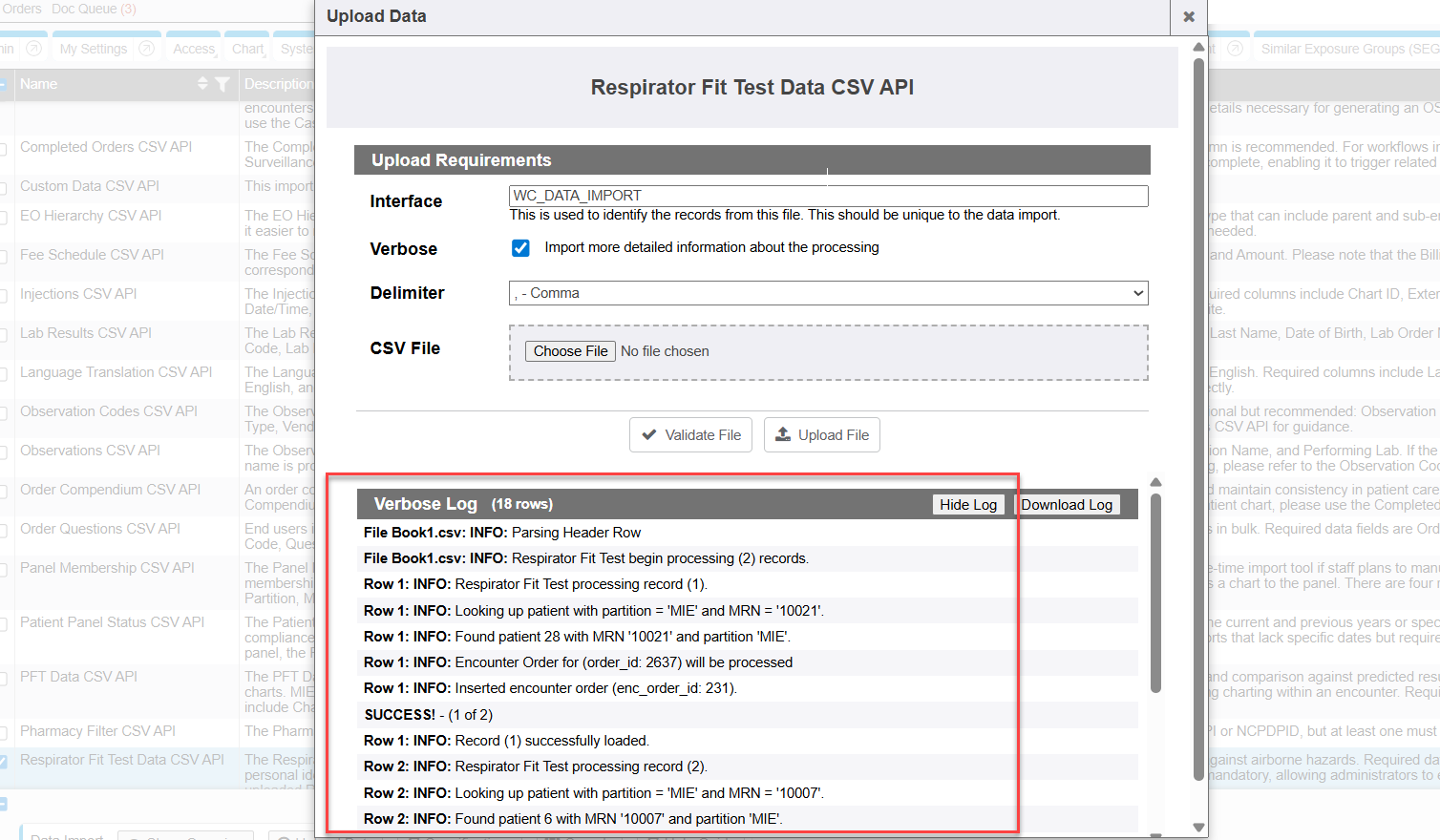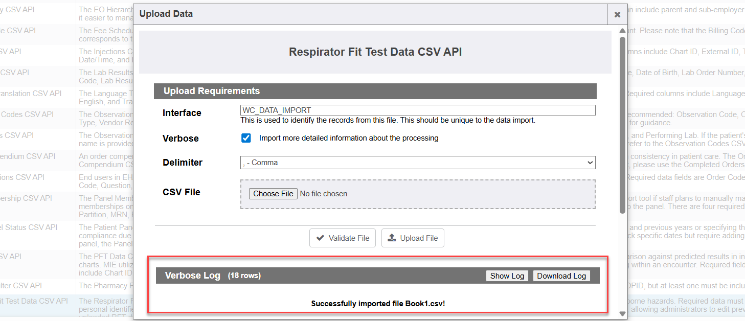 - Show Log: Click this to see an overview success or errored per row of the CSV file that was imported. It does not granular Verbose detail in the log, since Verbose was not marked to be utilized.