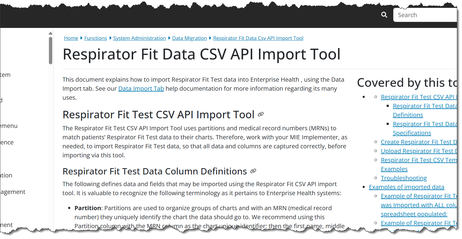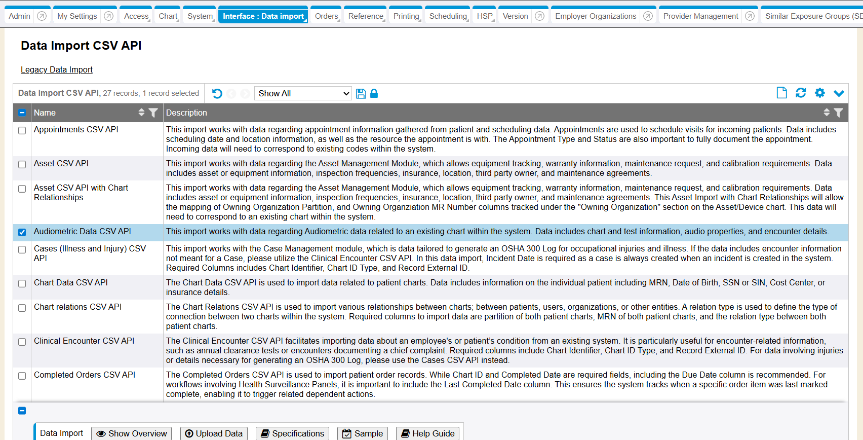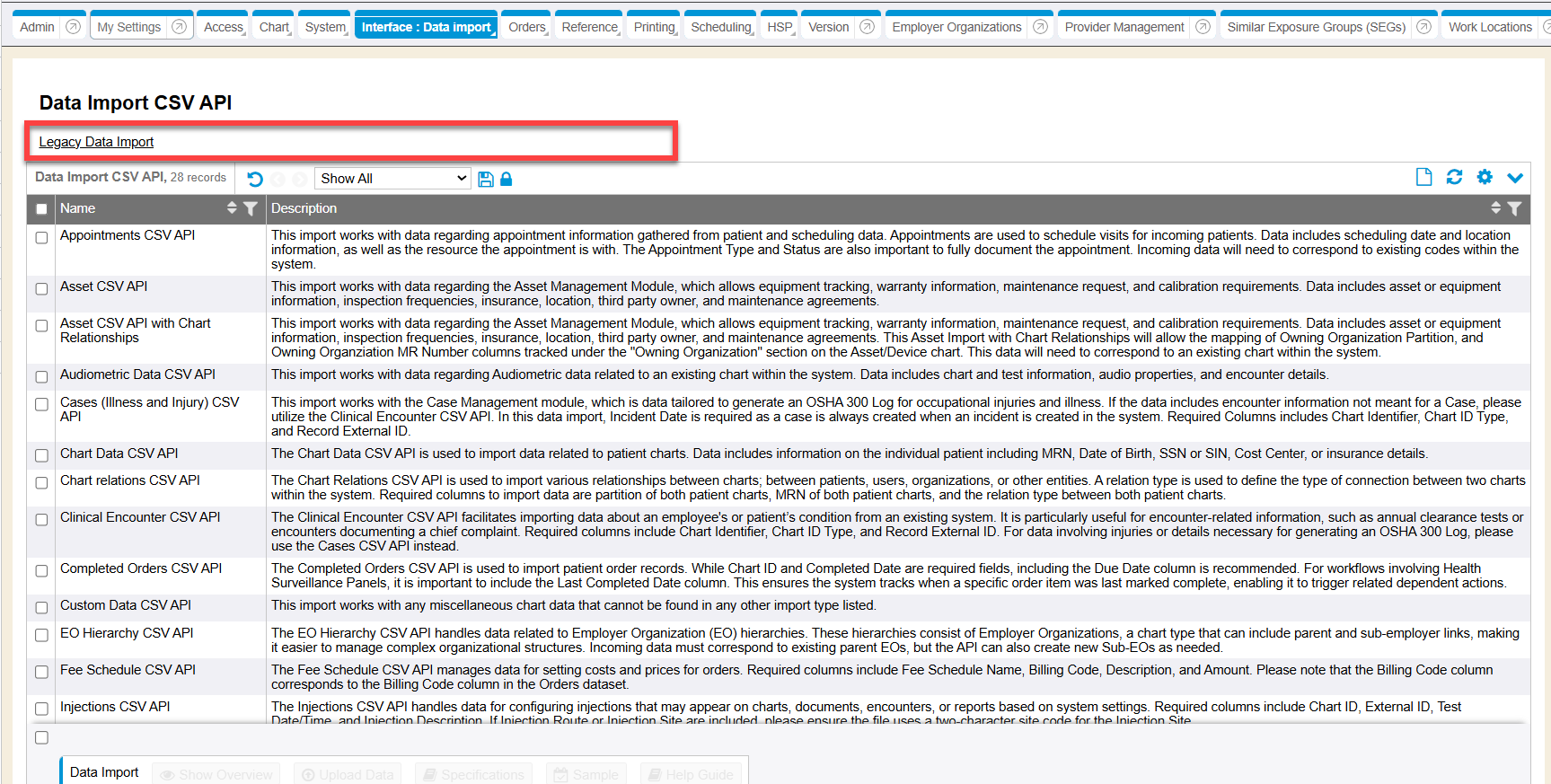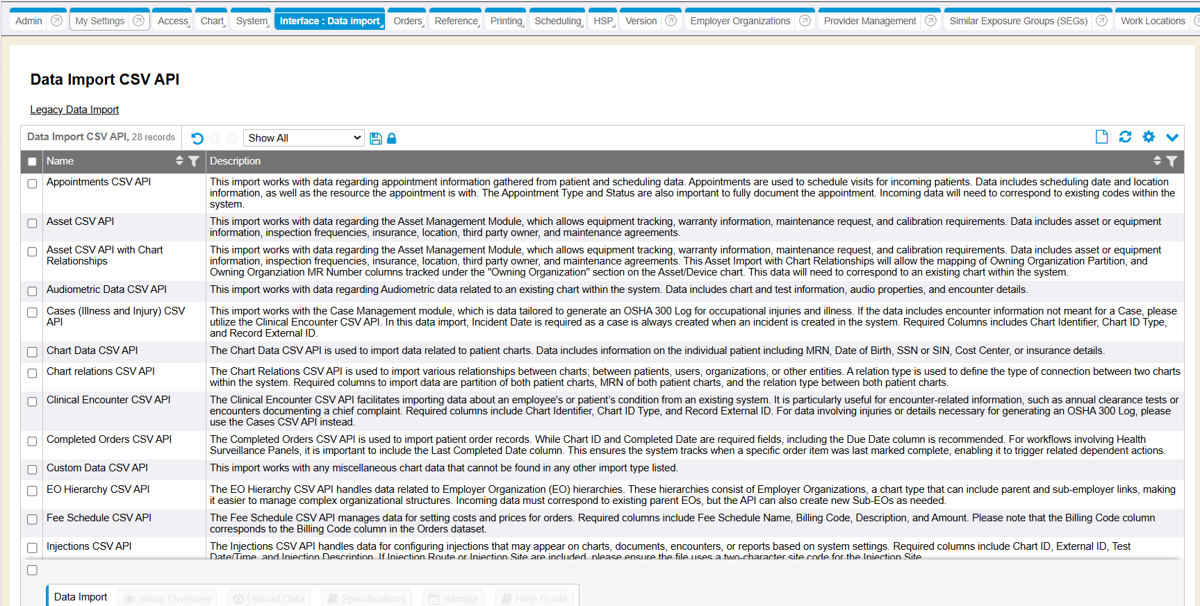 - Help Guide Documentation: Will take the user to a separate window tab of the Enterprise Health published help guide specific to the import selected.