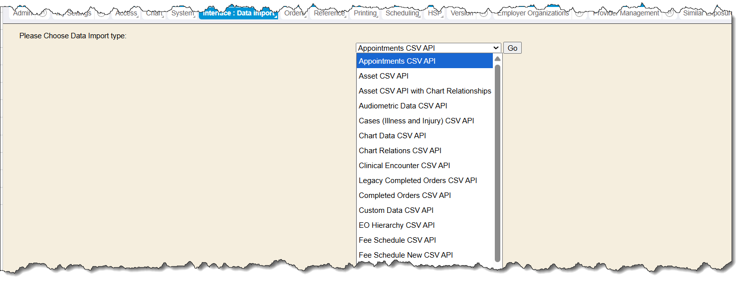 Once in the Legacy Data Import tab, use the drop down to select the Enterprise Health data import type and click the GO button to continue on.