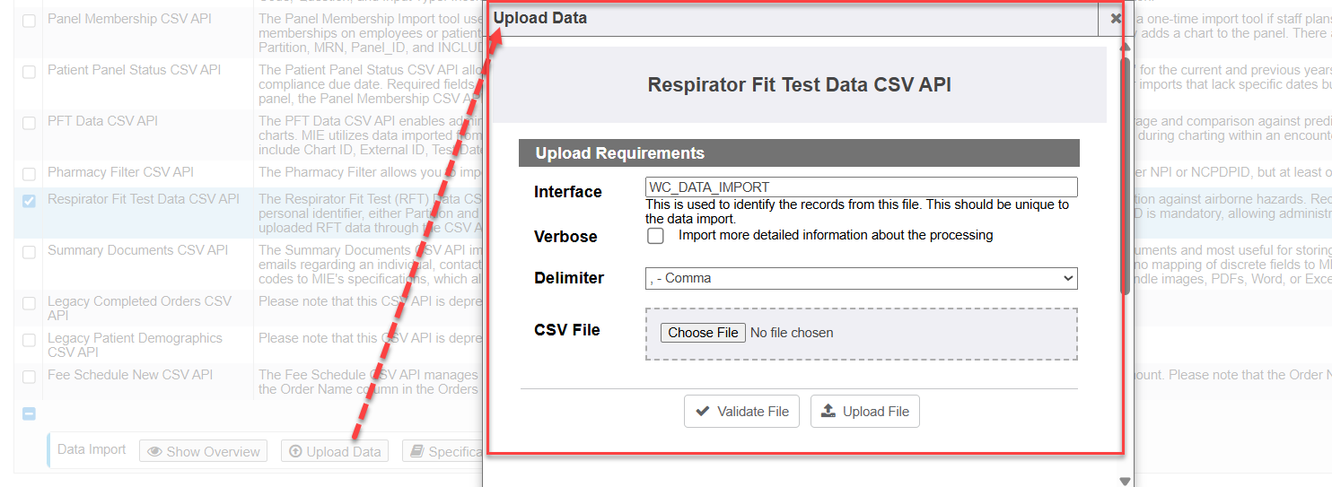 The Upload Data pop-up window shows the field requirements (Interface, Verbose checkbox, Delimiter) and the CSV file field to browse and upload the CSV file needing to be imported that is for the specific Data Import selected.
