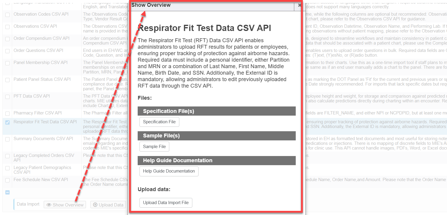 The Show Overview button essentially is a pop-up window with the Data Import’s specific overview of what it will import, along with all the other option abilities (view specification files, view sample files, view any help guide documentation for the specific import selected, and ability to upload/import the data) all within the same pop-up window.
