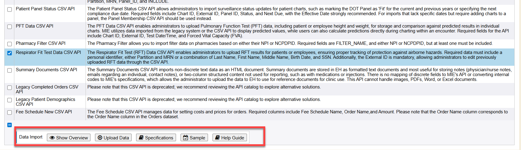 Within the redesigned Data Import page, a specific data import api tool is able to be selected (checkmark) and then displays individual buttons for the user to access/see/obtain information for an Overview, Specifications information, Sample file information, Help Guide, and the Upload Data screen for the specific Data Import API selected.