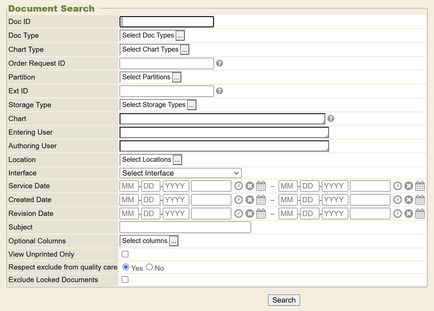 Select criteria to search by. Typically Doc Type and Service Date ranges are used to limit results. Use the Detail View and Modify Search links to manipulate the search results, as needed.