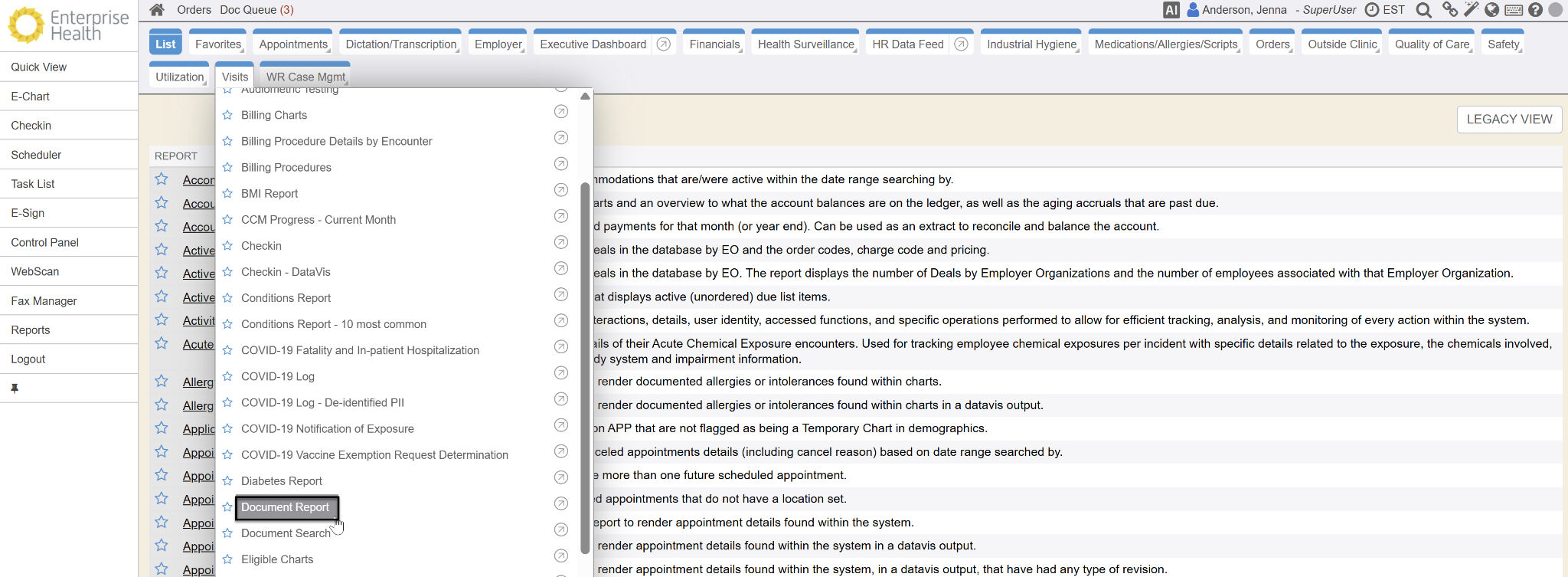 - Select the Visits report list and select the Documents Report.