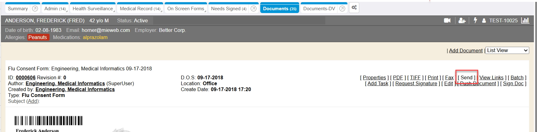- To send a document via Direct, click on the ‘send’ link near the properties of the document.