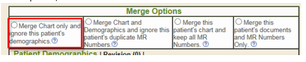 c. It's very important to always select the 1st merge option when working the DIRECT partition in the document queue. Every message comes in with a unique direct id# (mr#) and we don't want to keep those on patients for tracking purposes. This 1st option will merge and only keep the MR number of the chart the documents & chart are being merged to (regardless of partitions being merged), meaning it will keep the patient's current MR#'s and not apply the direct lengthy unique MR/ID # one.