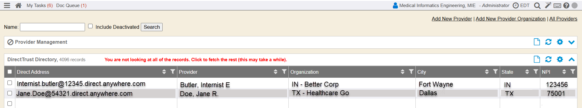 For Enterprise Health systems that have Direct Messaging configured, a DirectTrust Directory will display in a datavis format under the Provider Management DataVis. Clients not set up with Direct Messaging will not see a Direct Trust Directory in their system.