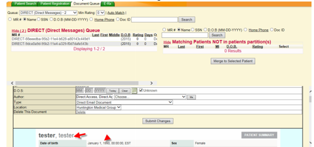 b. Users must go into the document (via the document queue) to see who it's pertaining to. Click on the DIRECT message to view the document on the bottom half of the screen. View the document to determine who it's pertaining to. Process the message by setting the DOS (or leave marked as "unknown" if you want the date to be a blank DOS, which will default the document at the bottom of list views in chart tabs), then on the right side of the document queue to manually search who to merge this document to.