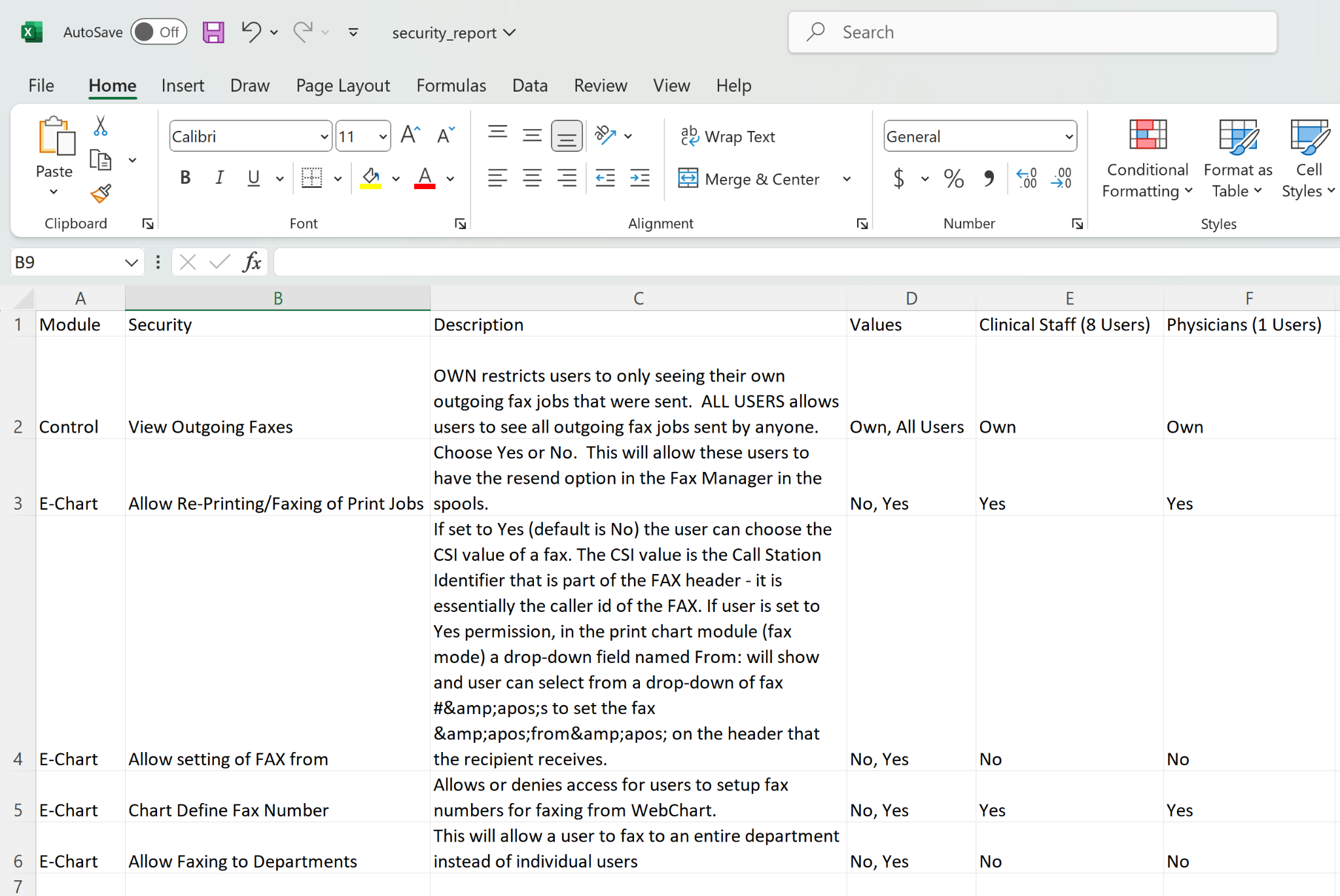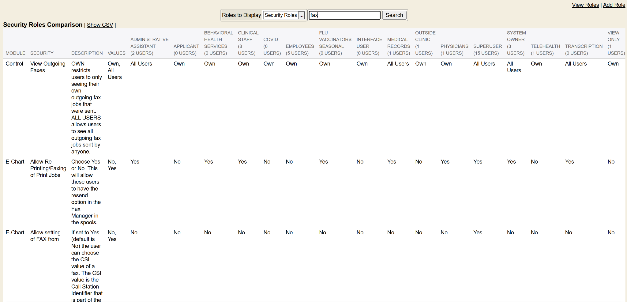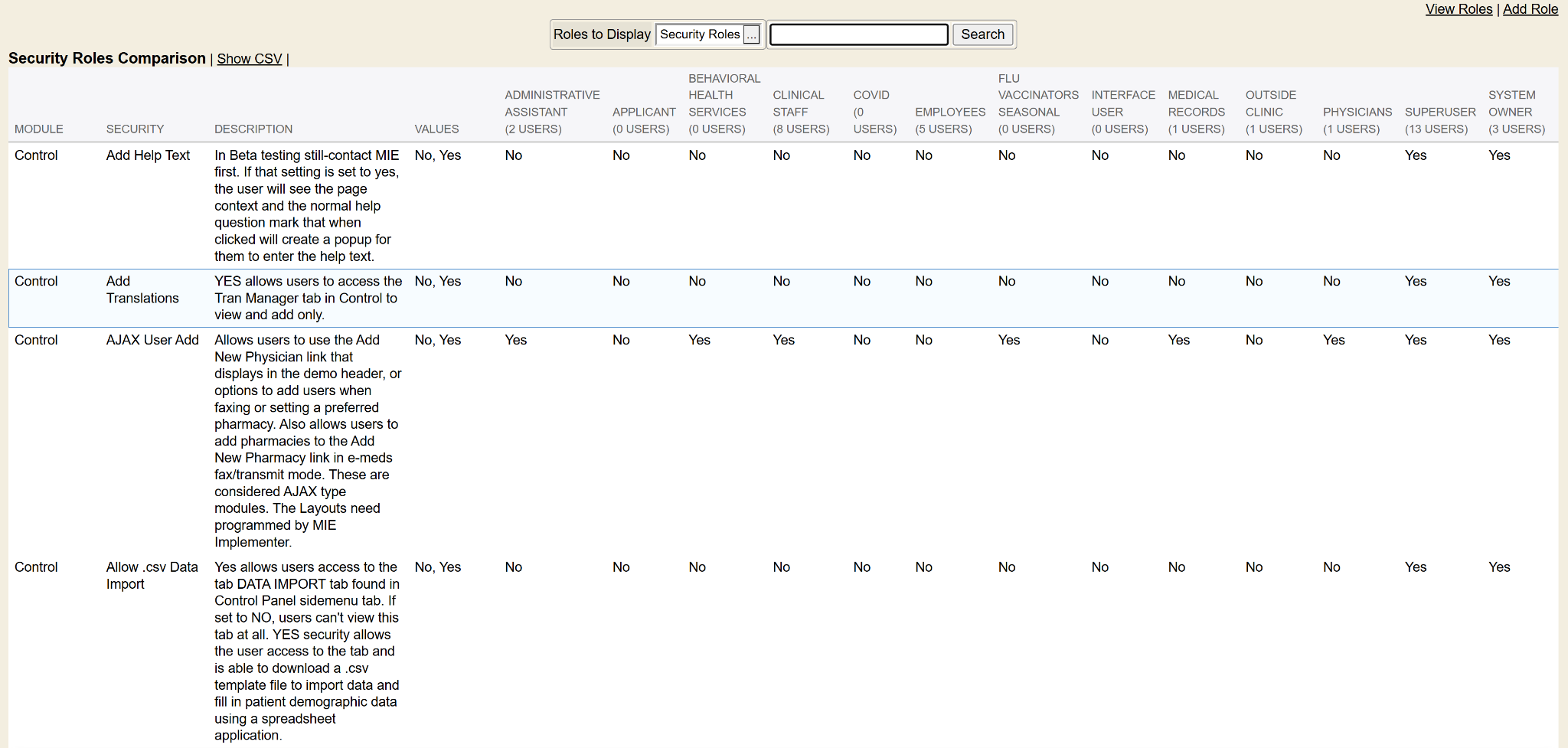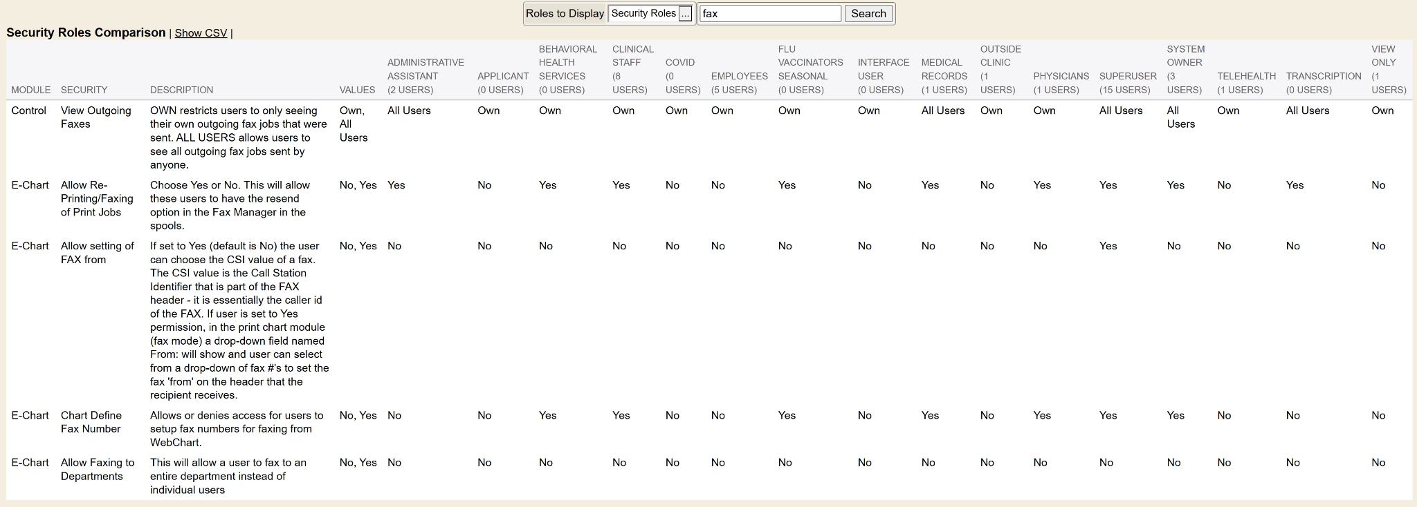 The next columns are each of the security roles you have in your Enterprise Health system along with the user count for the security roles. Below each security role column, it shows the value that the security role is set to for a specific security.
