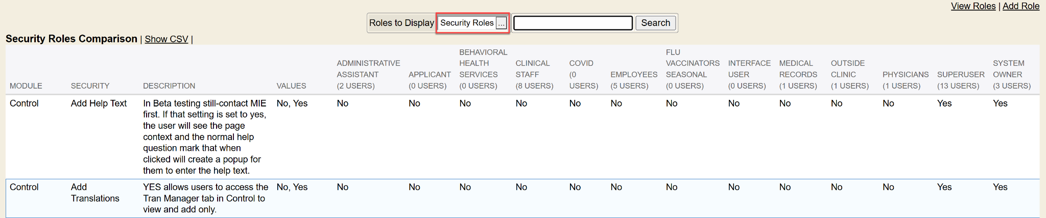 Compare/Show Specific Security Roles
