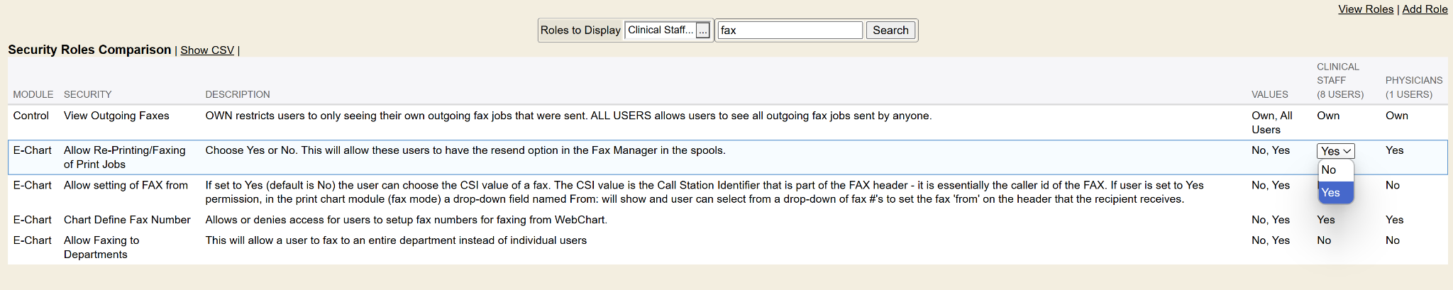 In the example below, we decide to deny the Clinical Staff’s ability to re-print/fax in Enterprise Health . I click the yes value in their Clinical Staff column for that specific security setting (because that is what they are currently set to—Yes they can Re-Print/Faxes) and then that drop-down opens to show a No or Yes drop-down. I change it to No.