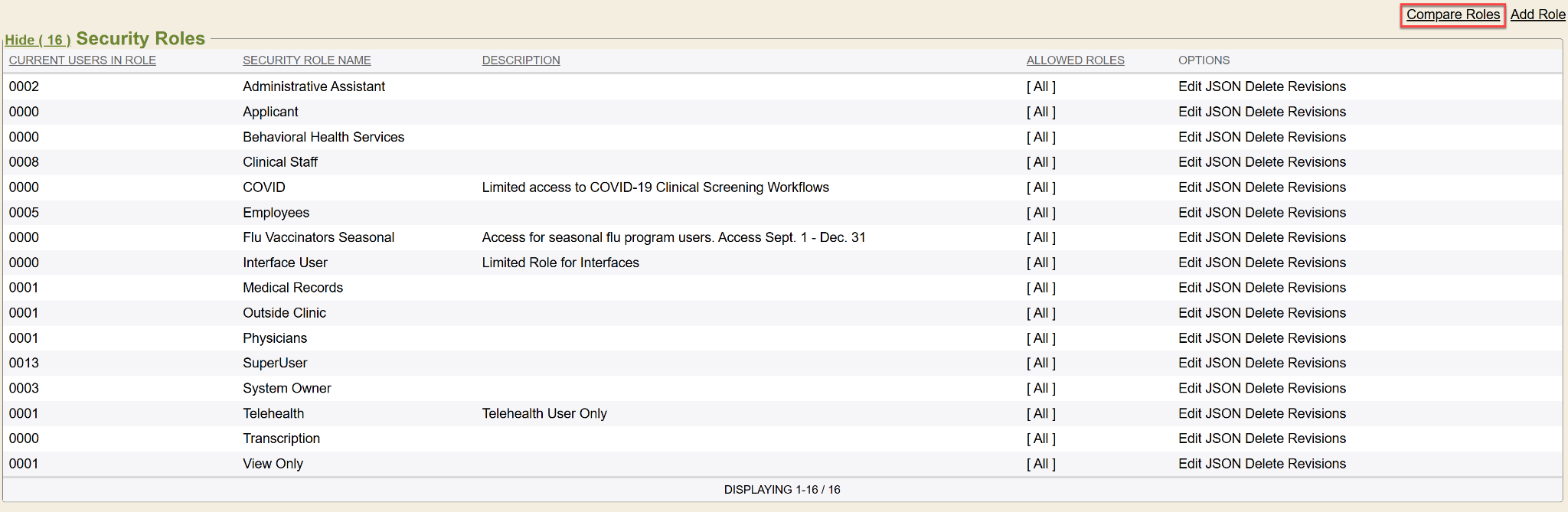 So, to narrow down and compare specific security roles, click the Roles to Display button in the fields at the top.