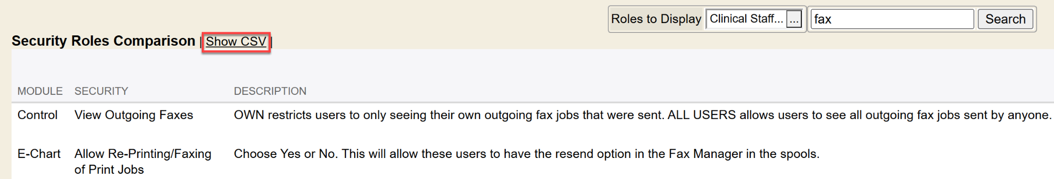 In the example below, I searched for keyword of fax. It then displays the 5 security permissions Enterprise Health has regarding ‘fax’ that it found as a match.