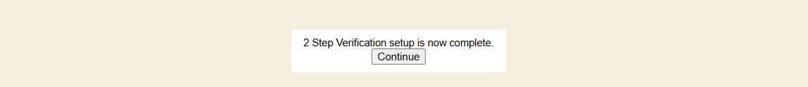 If successful, you will see that your 2 Step Verification setup is now complete. Click the Continue button.