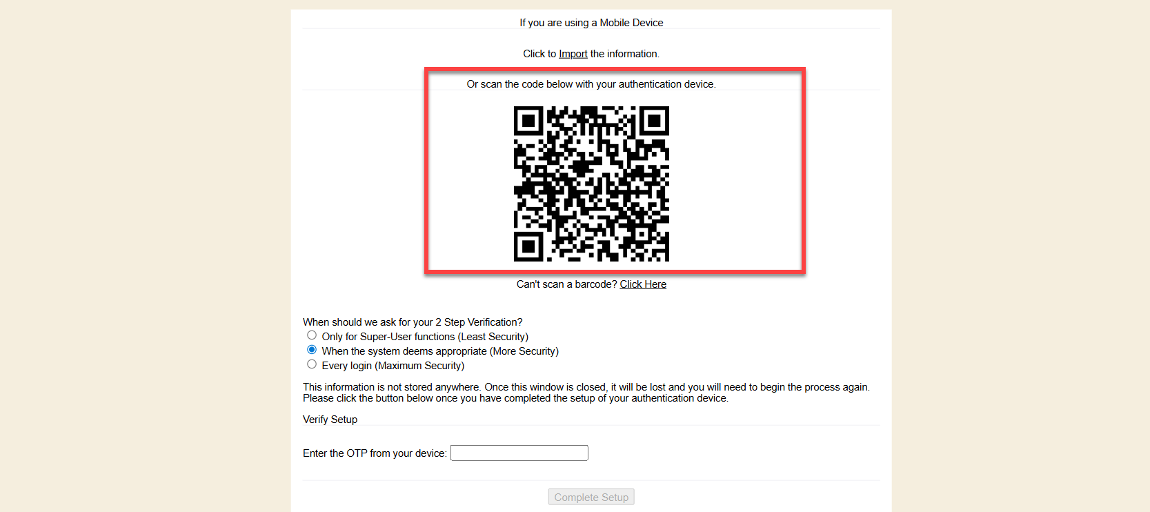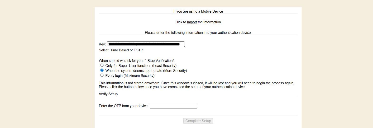 The next screen regarding MFA/2FA will display contents based on what the system wide system setting for Use 2FA is configured to.