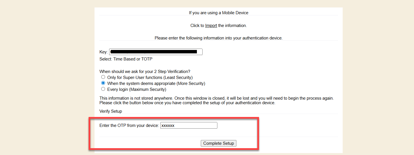Go back to Enterprise Health system screen and Enter the OTP from your device. Next, click the Complete Setup button.