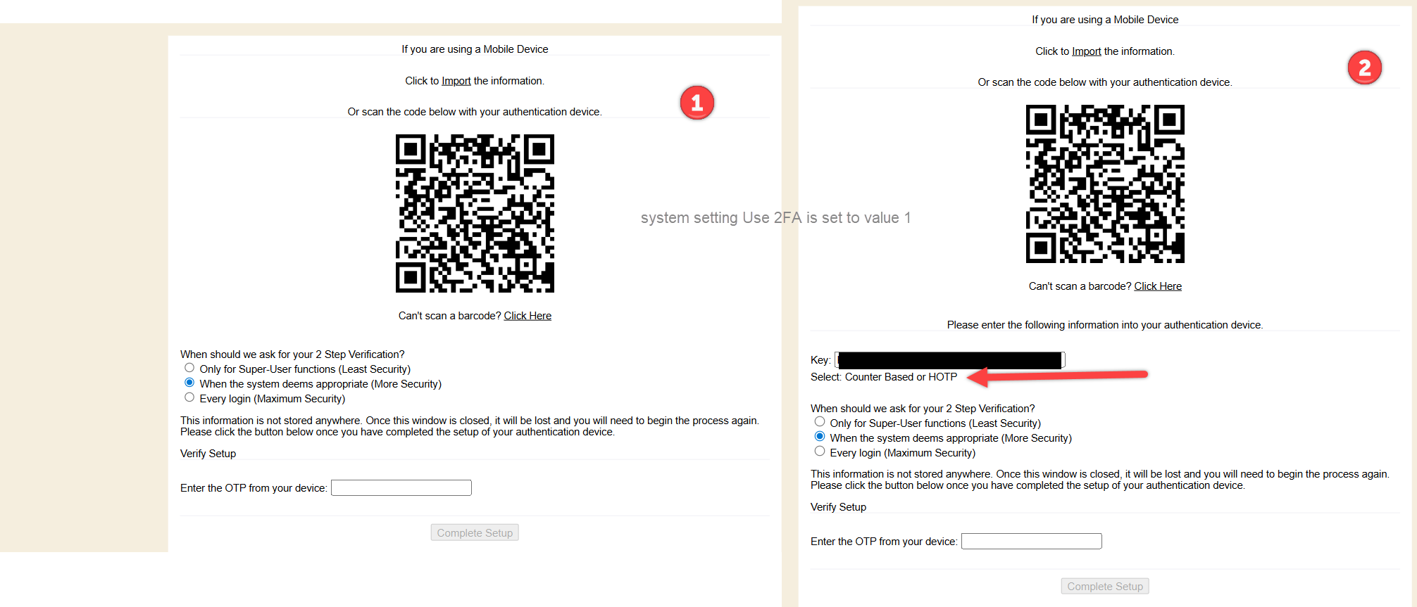 System setting ‘Use 2FA’ is set to value 1 (HOTP counter based):