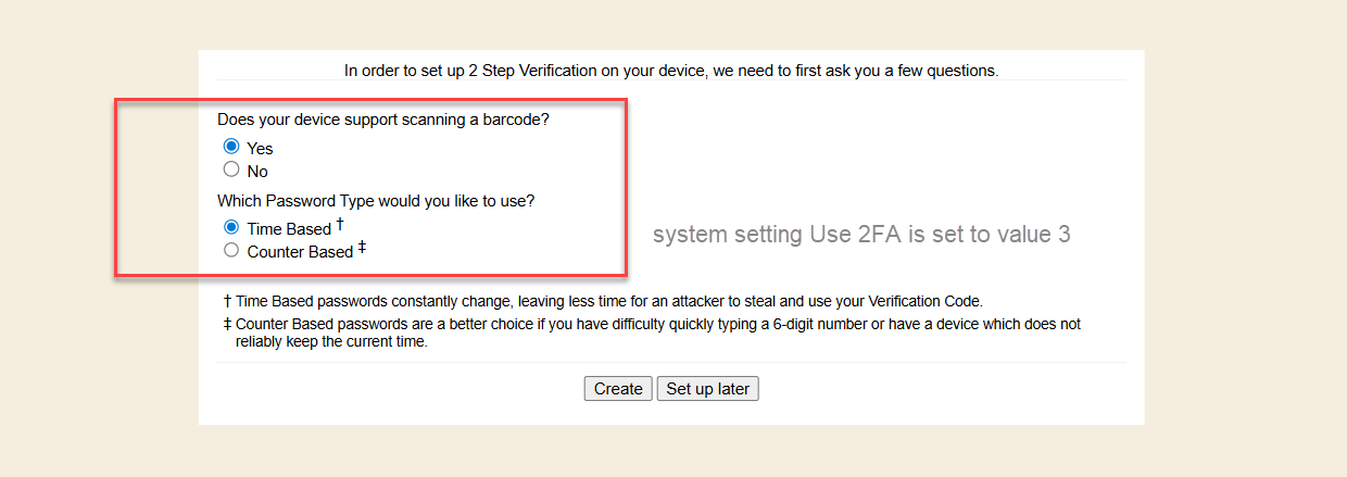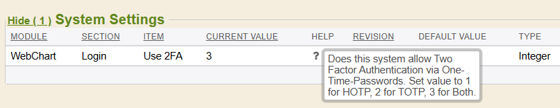 System setting ‘Use 2FA’ is set to value 3 (offers either HOTP or TOTP for the user to select):