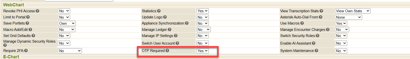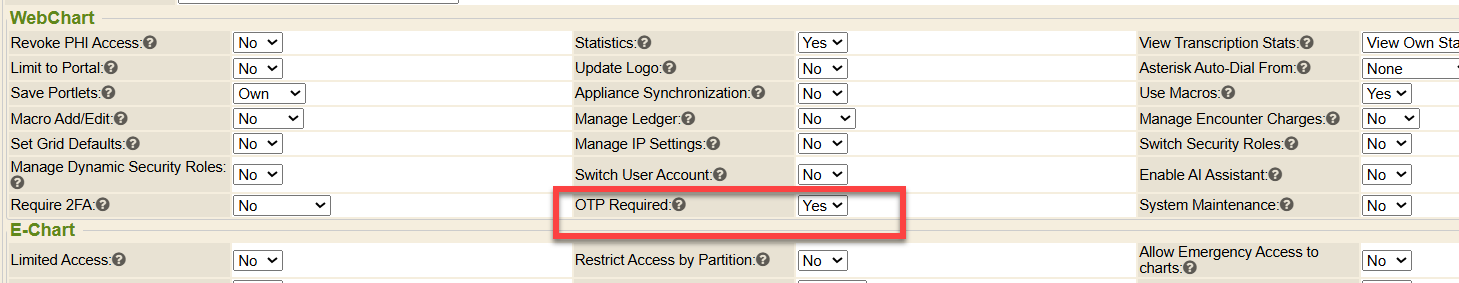 - Yes - Requires users to sign in with their username and password but in addition requires them to include a one-time password (OTP) that will be generated by the system and emailed to them instead of using an external device or app to generate the OTP. An email must be on the user’s chart.