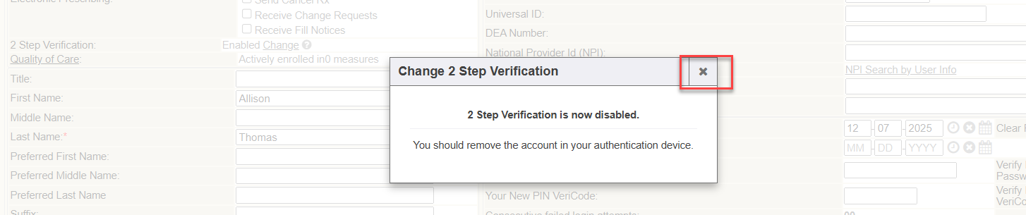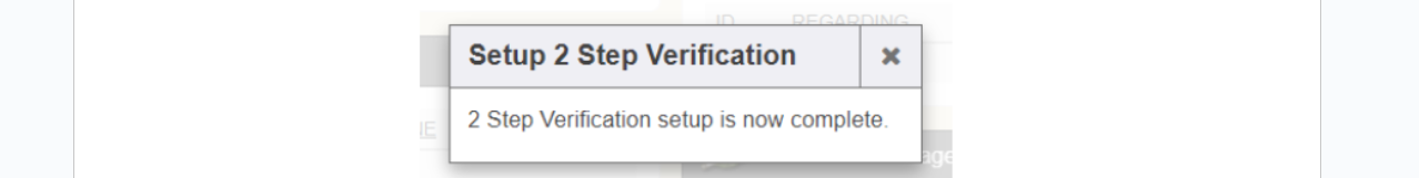 After clicking Complete Setup, you will receive a pop-up message if 2 Step Verification was successfully completed for the user.