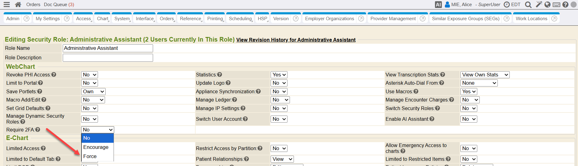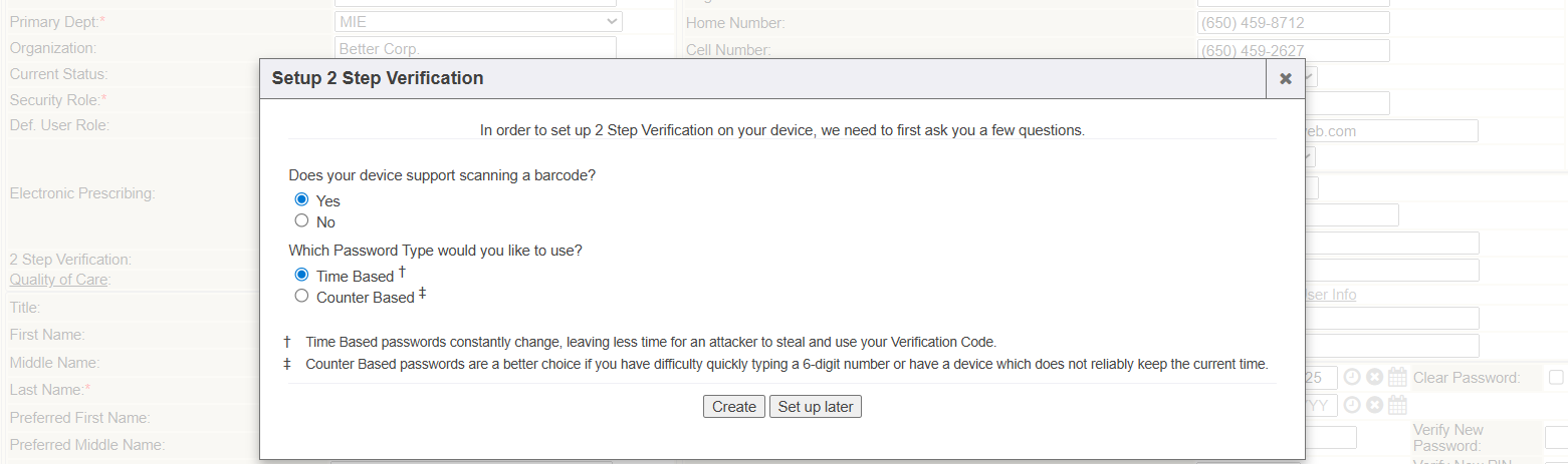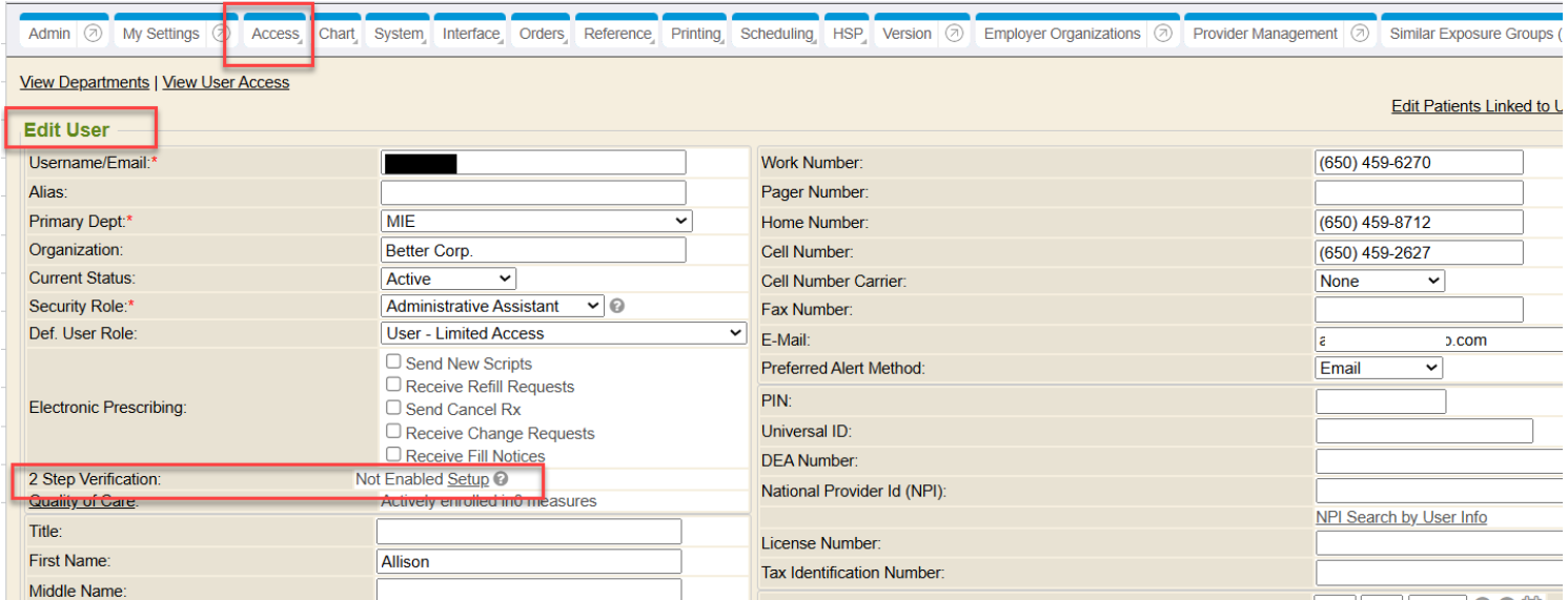 Once MFA/2FA is configured for specific security roles, an individual user can be setup, reset, or re-provisioned from their Edit User page within Access Control by a System Administrator with rights. Setup is completed most easily on a device that has 2D barcode scanning capability by following the prompts in Enterprise Health and on your device; however, setup can also be completed with a device that does not support barcode scanning.
