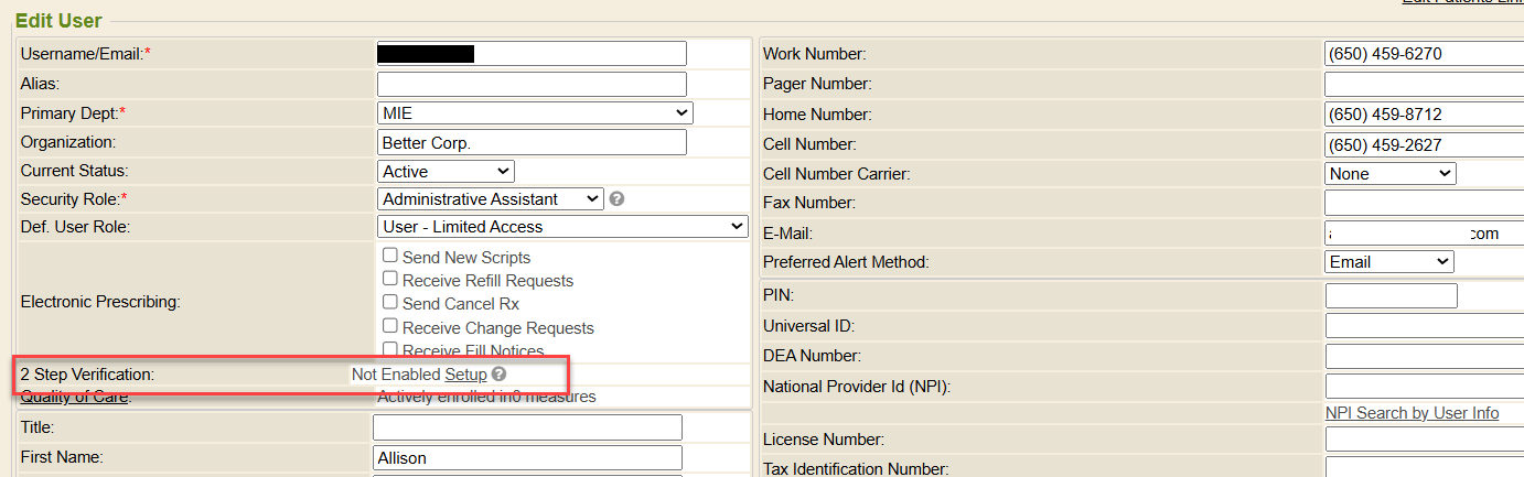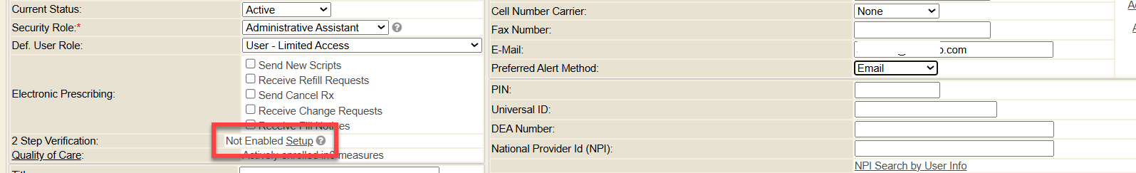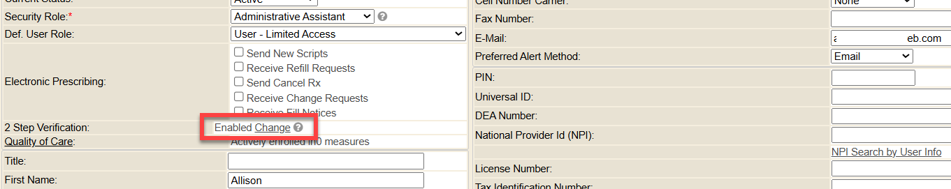 From within the Access Control screen, search for an individual user and click to Edit the User. Once in the Edit User screen, there is a 2 Step Verification field that will display. This shows if the user is enabled for MFA/2FA or not enabled.