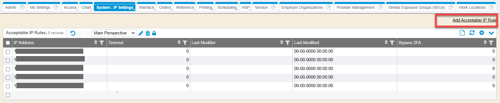 To add an IP address to be able to bypass 2FA, simply click the Add Acceptable IP Rule hyperlink found at the top right of the IP Settings.