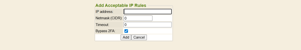 Within the Add Acceptable IP Rules, type in the specific IP Address and have the Bypass 2FA checkbox marked. Add to save your work.
