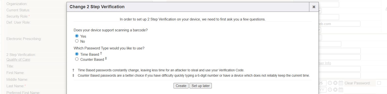 Select the desired selections from the 2 Step Verification pop-up. Selections depend on the system wide system setting configured.