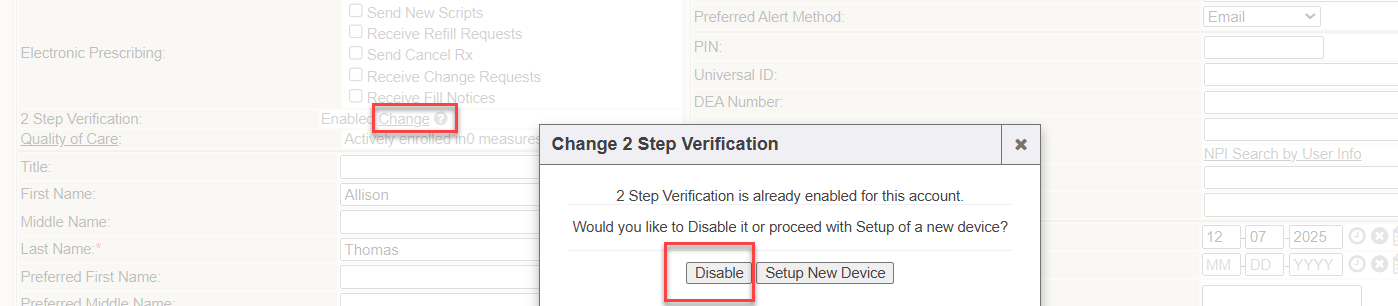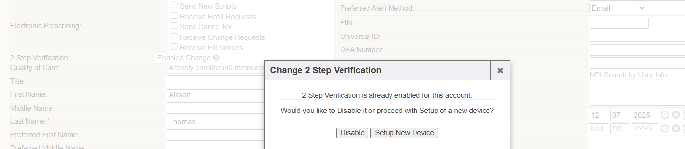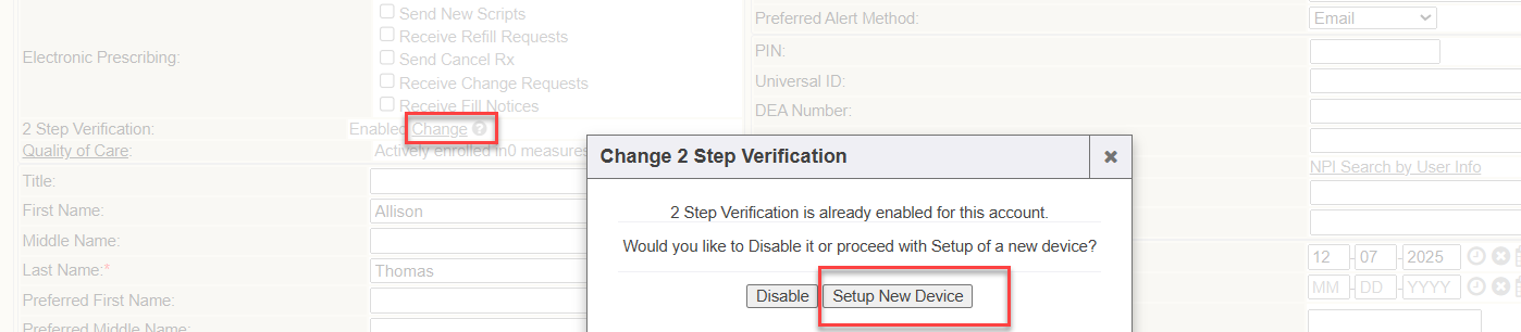 To change and setup the user’s 2 step verification on a new device, hit the Setup New Device button.