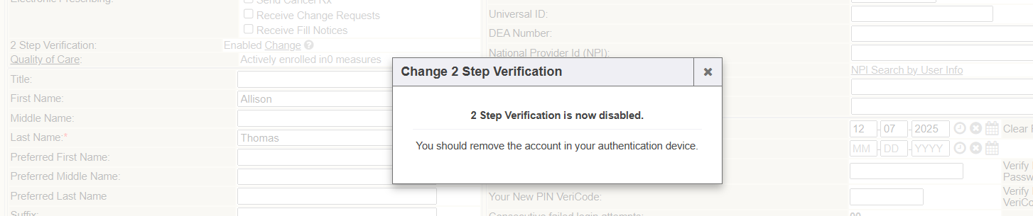 Upon hitting the Disable button, the message displayed will alert you that their 2 Step Verification is now disabled. The user should remove the account on their own authentication app being used on their device.