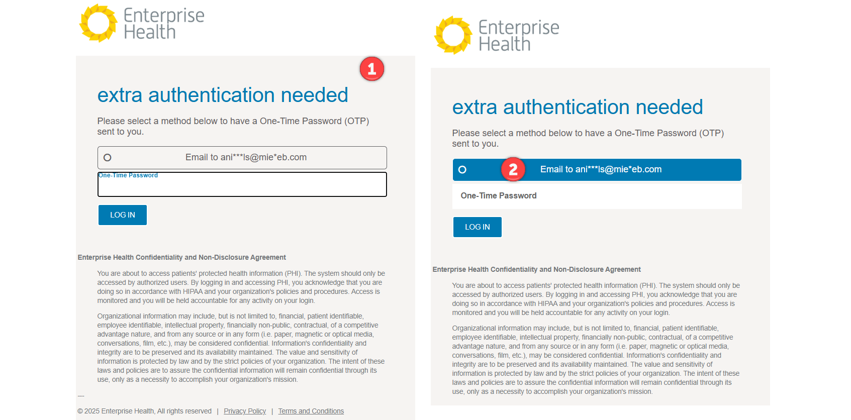 The Enterprise Health system supports Multi-Factor Authentication (MFA) or Two-Factor Authentication (2FA) using one-time passwords (OTP):