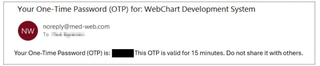 The default email notification of OTP is the following, however your Enterprise Health system may have a customized OTP Email Layout to provide other verbiage.