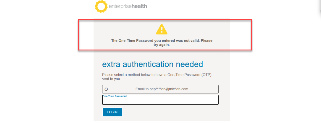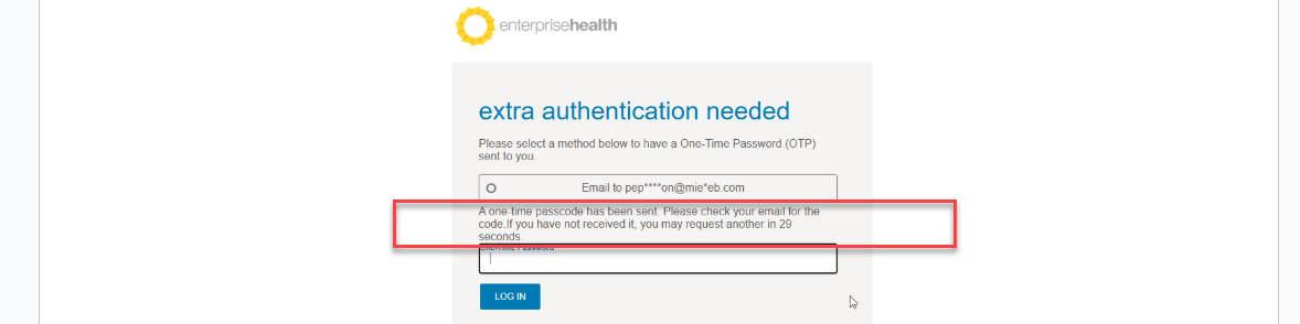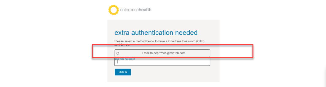 - The user will need to click on the bar/button to Email to their email address. Clicking on the email notification option will request an OTP (one-time password) be created and delivered by the Enterprise Health system.