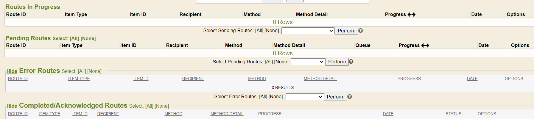 These are routes that have either timed out, reached the maximum number of tries to send, or have been marked as an error by a user. The routes in this section may be marked as “Acknowledge”, which will place them in the Completed/Acknowledged queue with the Progress “Acknowledged”. The route may also be marked as “Resend”, which will place it into the Pending routes queue, sending to the Routes in Progress queue when available. Marking a route as “Deactivate” will stop sending, unless a user manually reactivates the item.