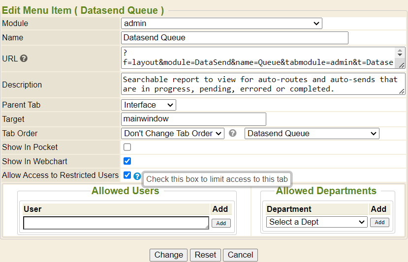 If the Allow Access to Restricted Users is checked, then there needs to be individual users or departments selected for who may access this tab. Always include MIE department for these tabs.