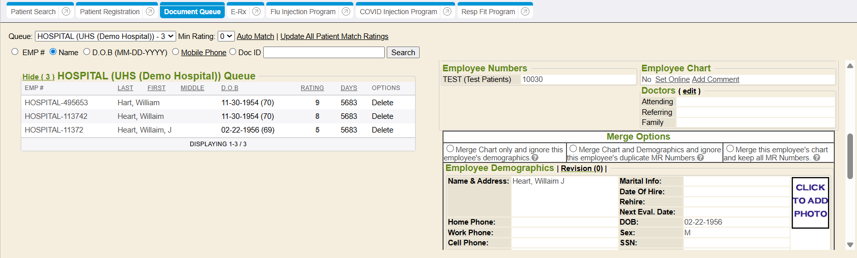 - Choice 1: Merge Chart only & ignore this employee’s demographics. What this means is that if selected, it will merge and only keep MR number of the chart the documents are being merged to (regardless of partitions being merged).