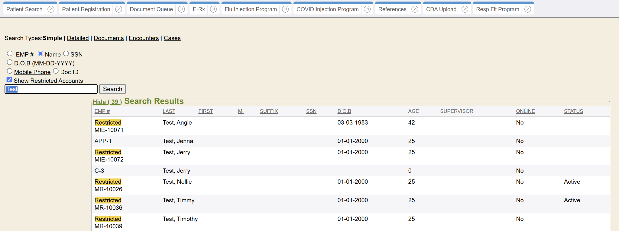 When it is check-marked, they can search for a patient or a document and see all matching search results. If the user has the Allow Unrestricted Pat Search setting set to Yes, it will show that the account or document is restricted, but they can get into it if need be for an emergency.